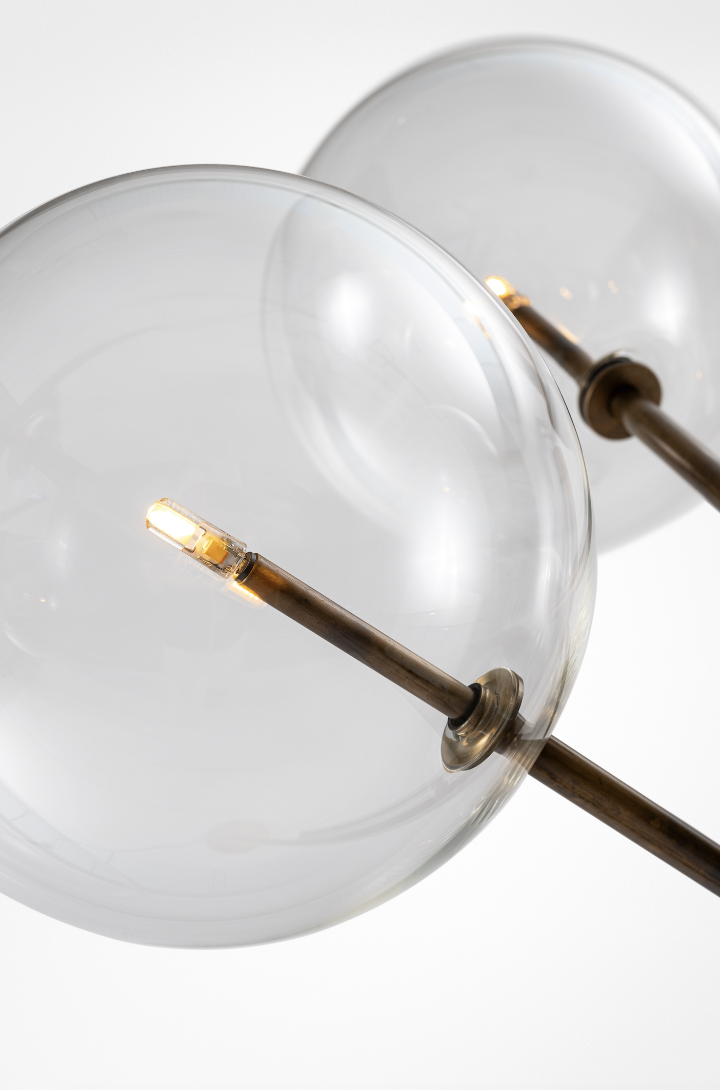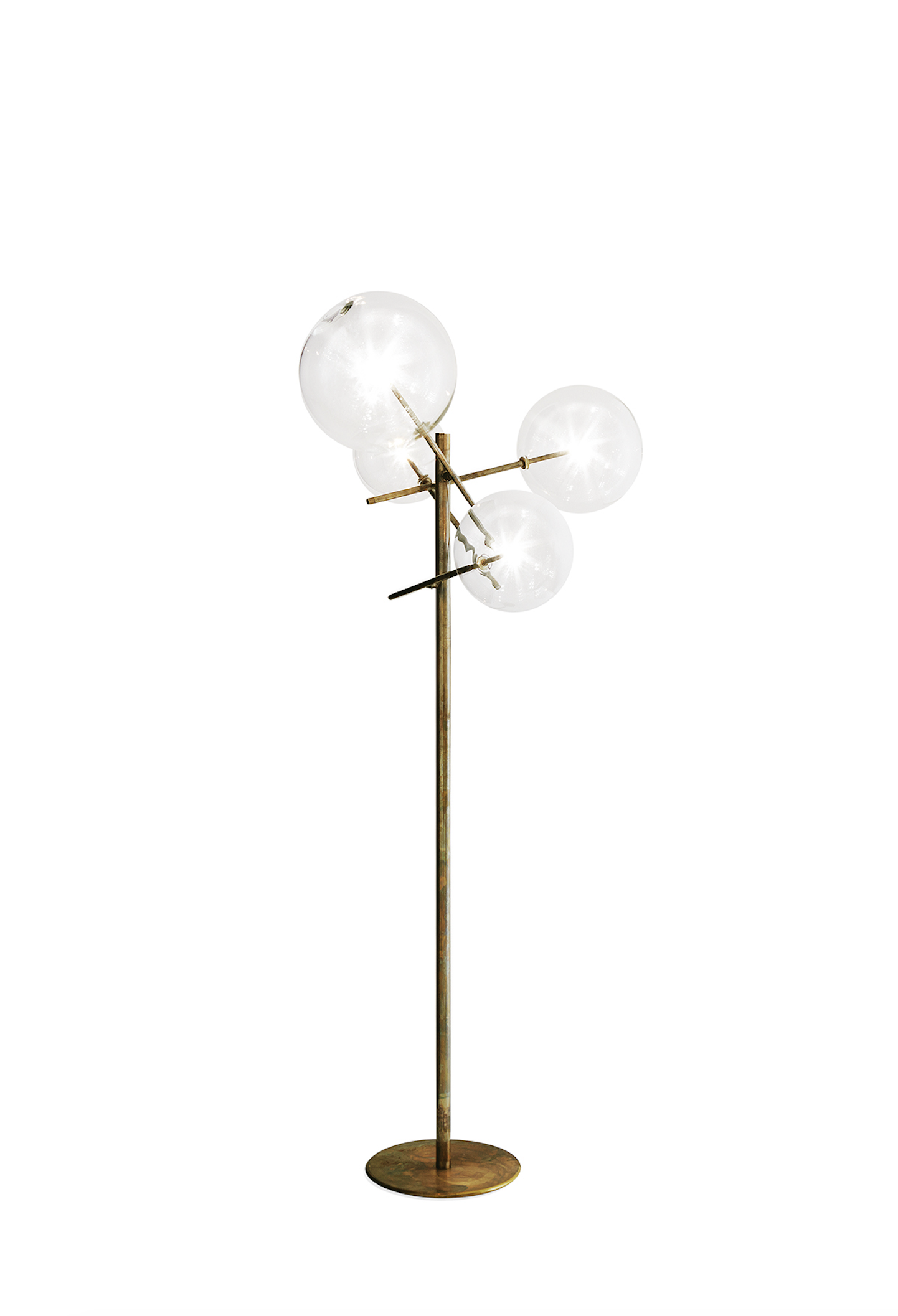 Floor lamp with dimmable LED light. Mouth-blown glass spheres. Metal parts in hand burnished brass. Dimmer on the power cable.