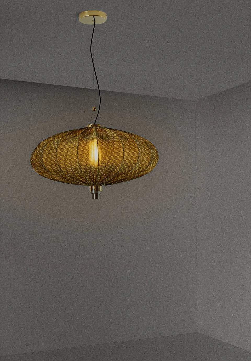 Ceiling lamp in painted metal covered with printed silk available in floral motif or plain silk (cream/off white color). Decorative details in polished brass and painted metal in three colors. Ribbed glass internal lampshade. Exposed power cord is considered as an essential part of the design.