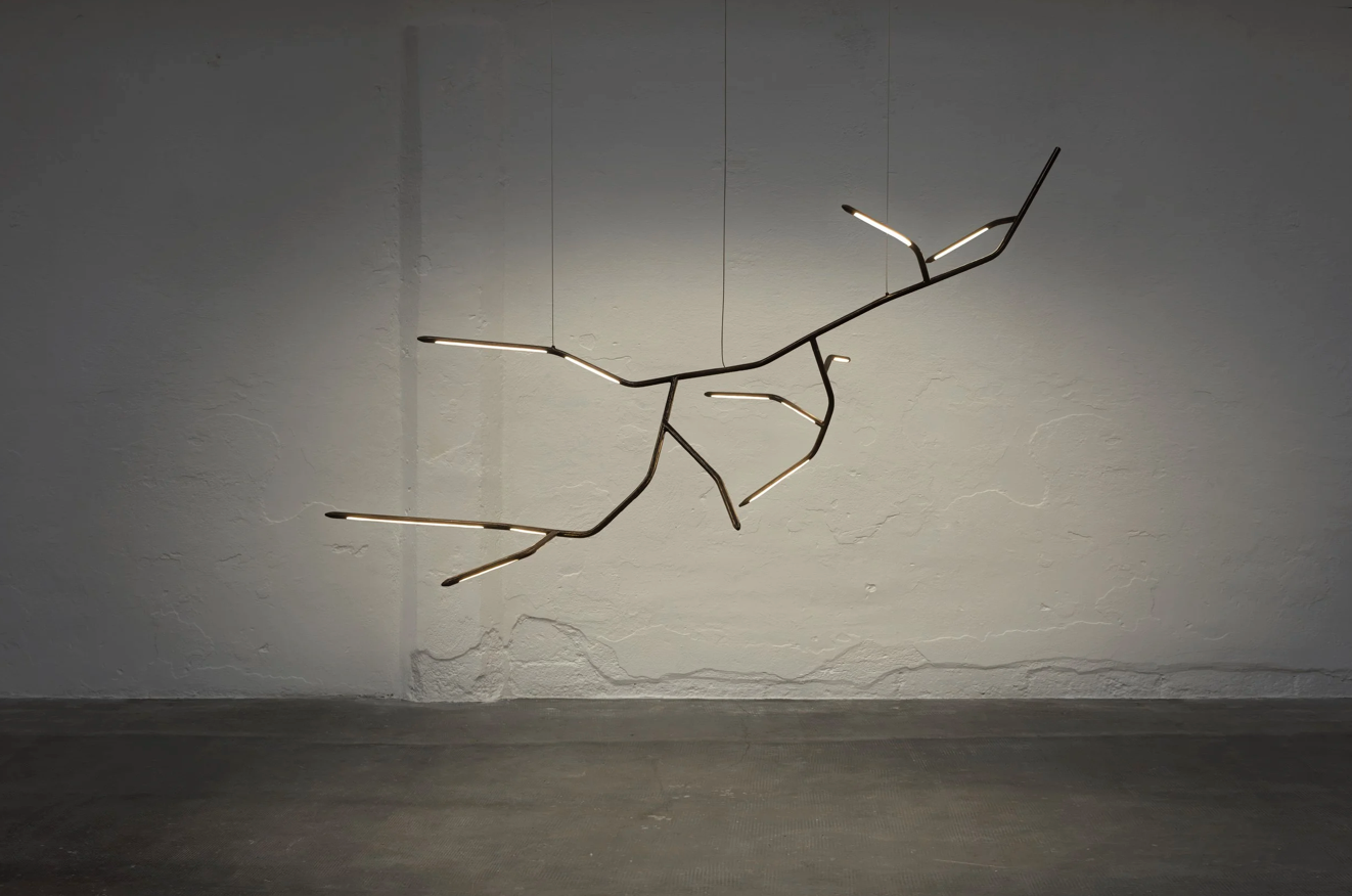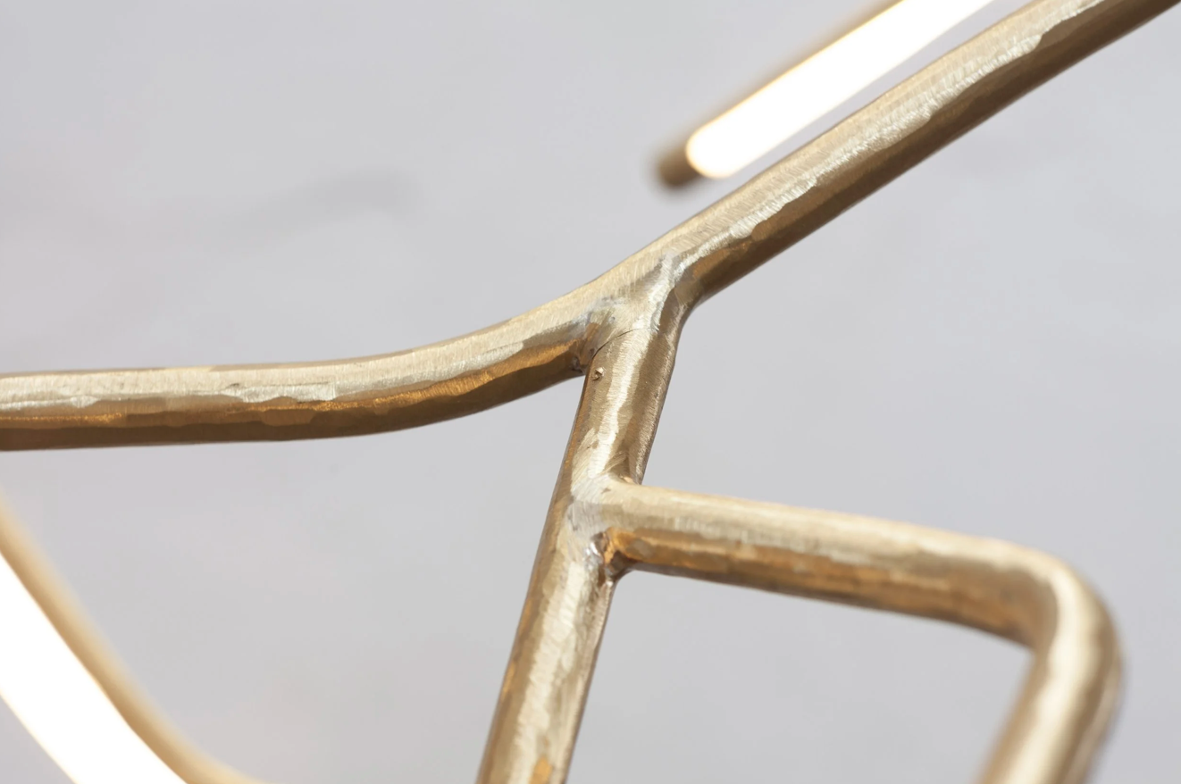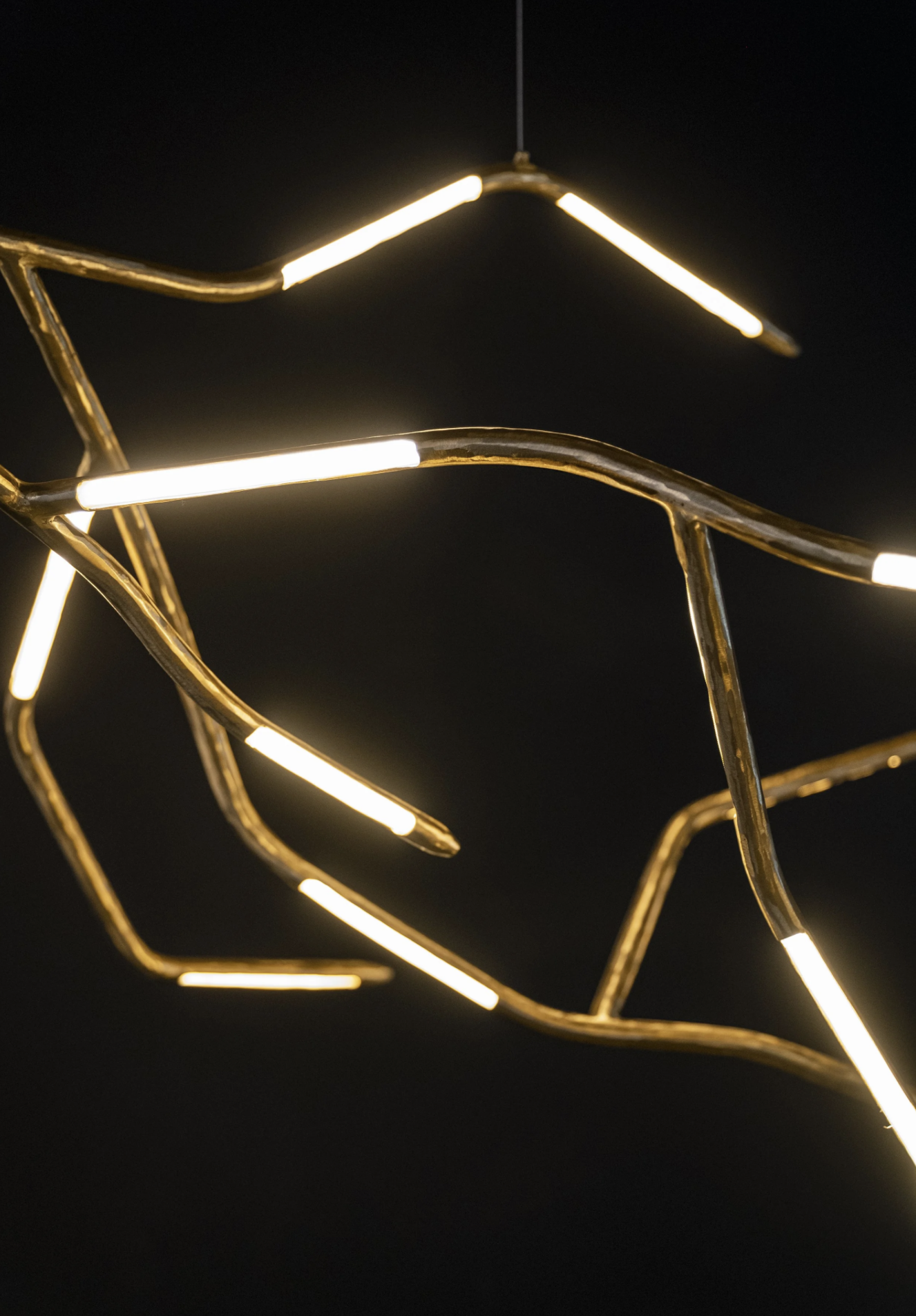 Dafne was born after a journey to Africa. Its shapes are inspired by the Umbrella Tree, but rather than provide shades as a regular tree it provides light. Each one of its brass branches, hand shaped with a blowtorch, has cracks where the light shines from. Like resin dripping from cuts on the bark. The brass surface is grinded and deliberately left raw. It’s name is a tribute to the Greco-Roman myth of Dafne, the beautiful nymph that was transformed into a tree after becoming the unwilling object of the infatuation of Apollo.