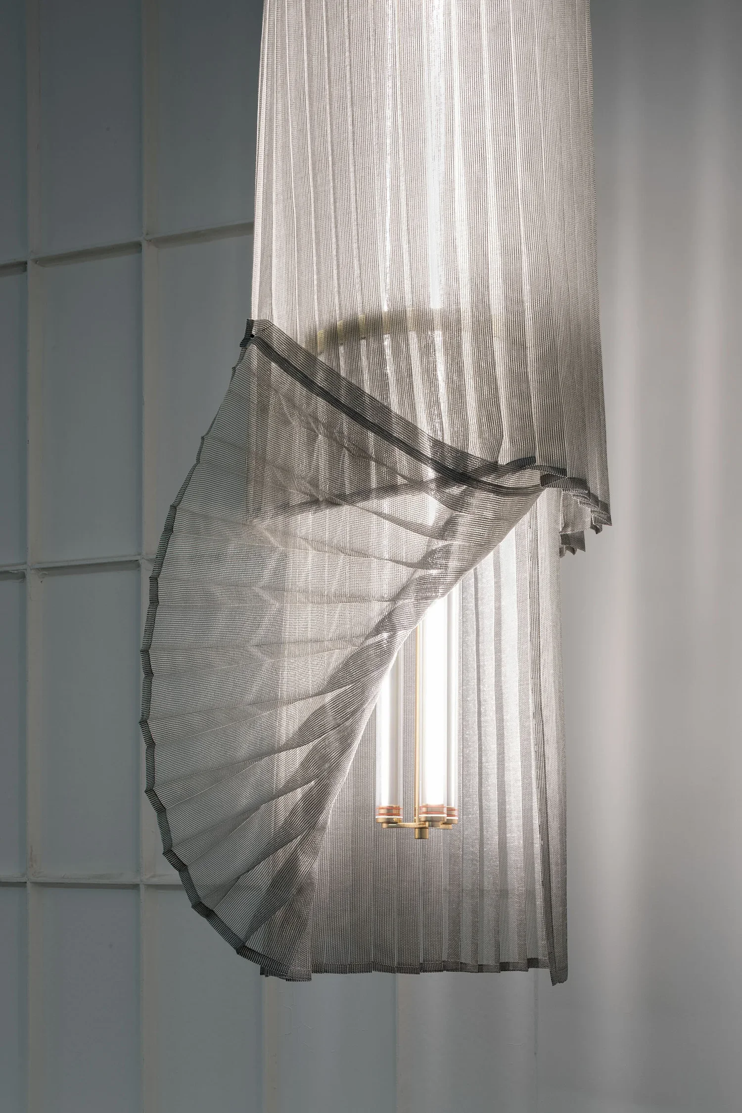 This lamp is an evolution of a SERVOMUTO’s light installation which evokes the visionary and playful architecture of Aldo Rossi, taking inspiration in particular from his Teatro del Mondo, an ephemeral project set afloat on the Venice lagoon during the 1980 Architecture Biennale and then moored at Punta della Dogana. Palazzi pendant features a light weight pleated Kvadrat fabric which reveals the polished brass structure of the lamp and the three led tubes, resulting in multiple light plays.