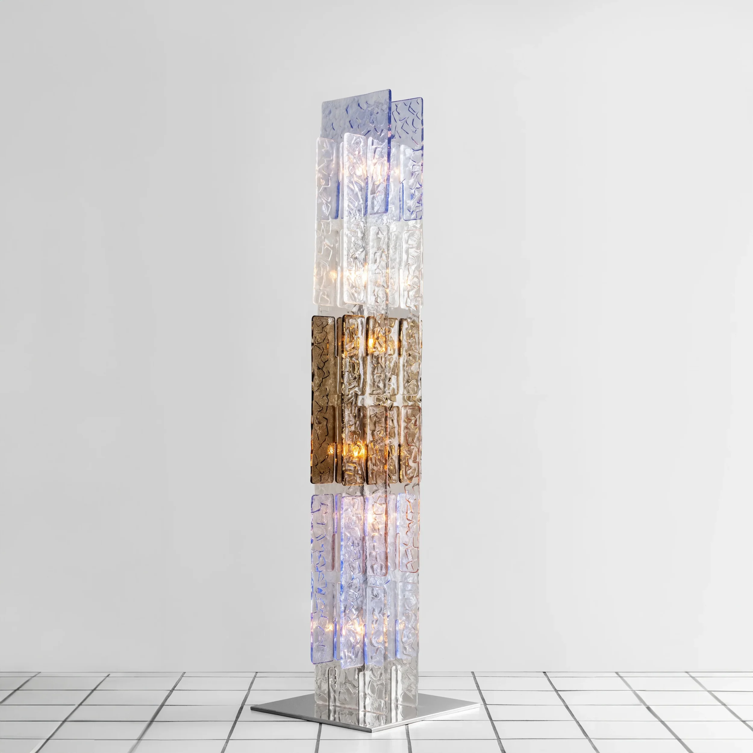 The Lina Totem floor lamp, designed by Hannes Peer, is a statement piece from the Paysage collection. A floor lamp made of Murano cast glass tiles featuring the typical handmade texture carefully stacked on top of each other, creating a visually striking design. Available in three color variations, the floor lamp can also be customized according to individual preferences, allowing for a unique and personalized piece. Lina Totem is a lamp that emanates a beautiful scenographic light, transforming the atmosphere of any room with its warm reflections, scattered in an enchanting pattern.