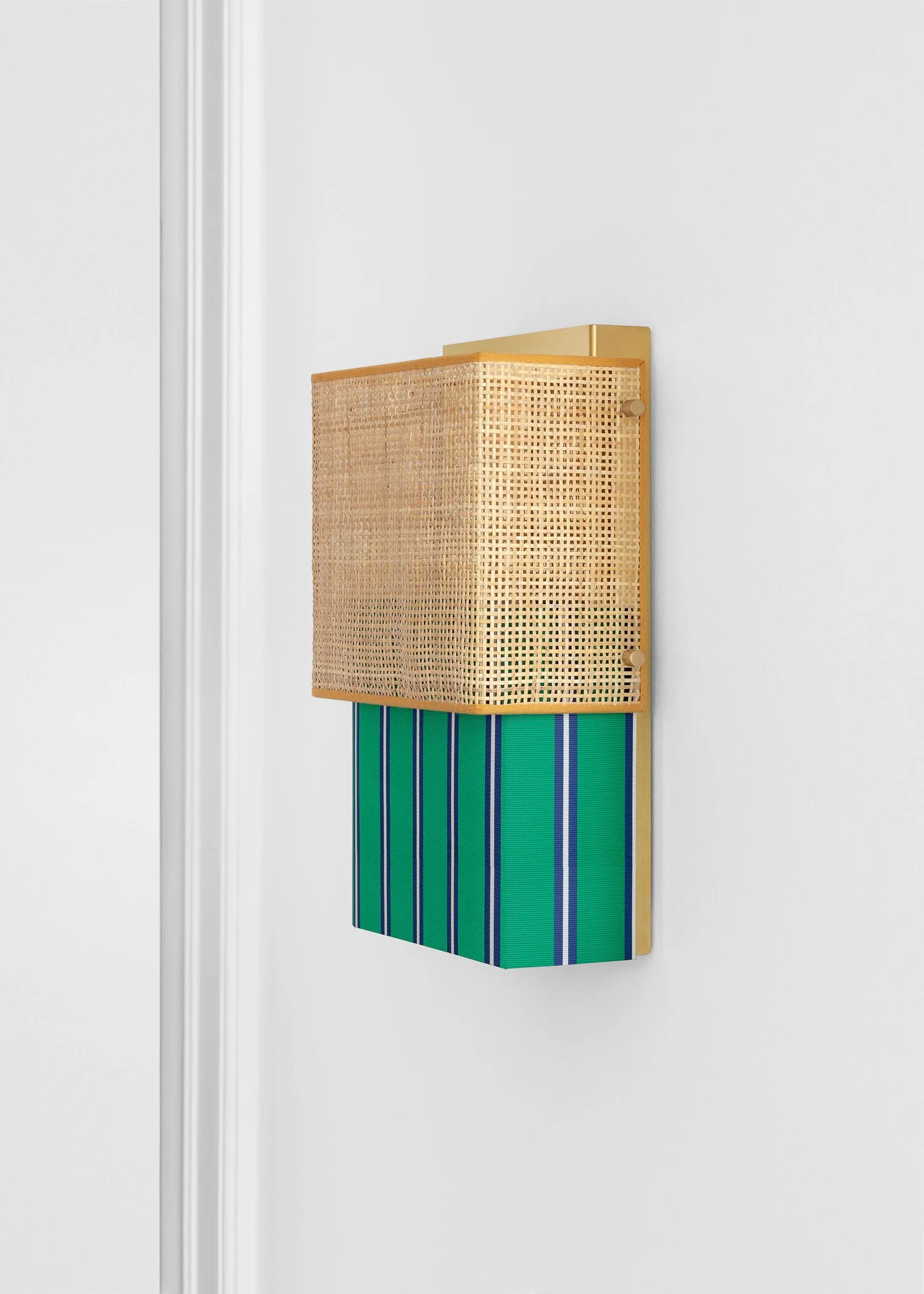 The idea for this lamp arises from the dialogue between vastly different materials. Rattan, with its wide weave that allows the light to be glimpsed as if through a jalousie, and a golden sheet, which reflects it. The light passes through these two materials and is held within it as in an architectural model; walls that slide, mirrors that reflect: a small architecture that houses light. Stripes, like a blind in the sun, give the idea of a facade, and suggest the motif of color in this luminous object. A classic ‘regimental’ stripe becomes a refined detail, poised between a sunblind and an impeccably knotted tie.