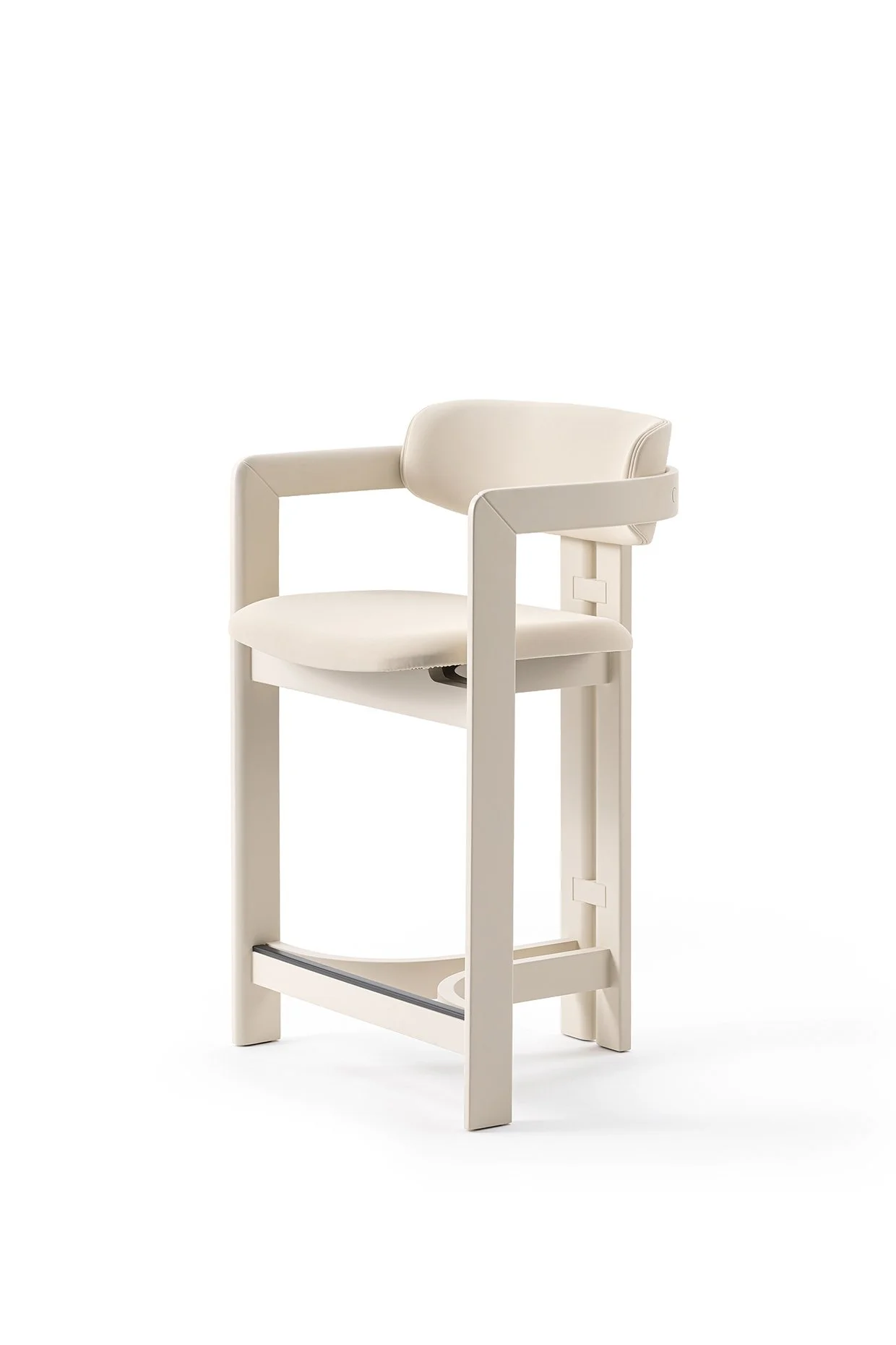 Stool with black stained open pore solid curved ash structure and anthracite grey lacquered metal footrest.