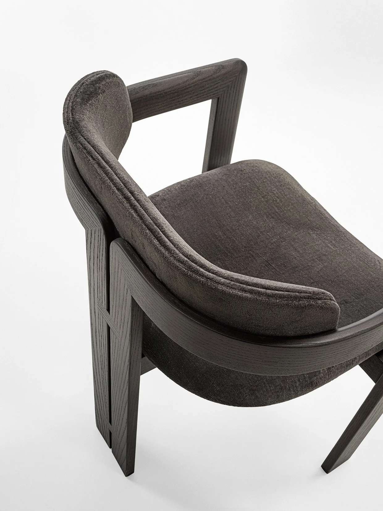 Armchair with solid curved wooden structure. Covered by fabric or leather.