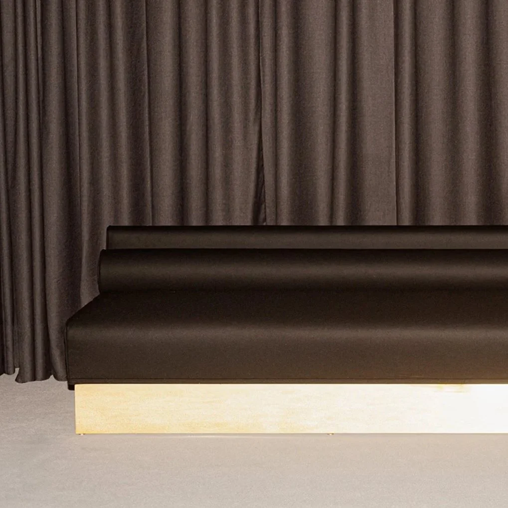 Sofa with bolster cushion. Padded in polyurethane foam and upholstered in fabric. Polished brass base.
