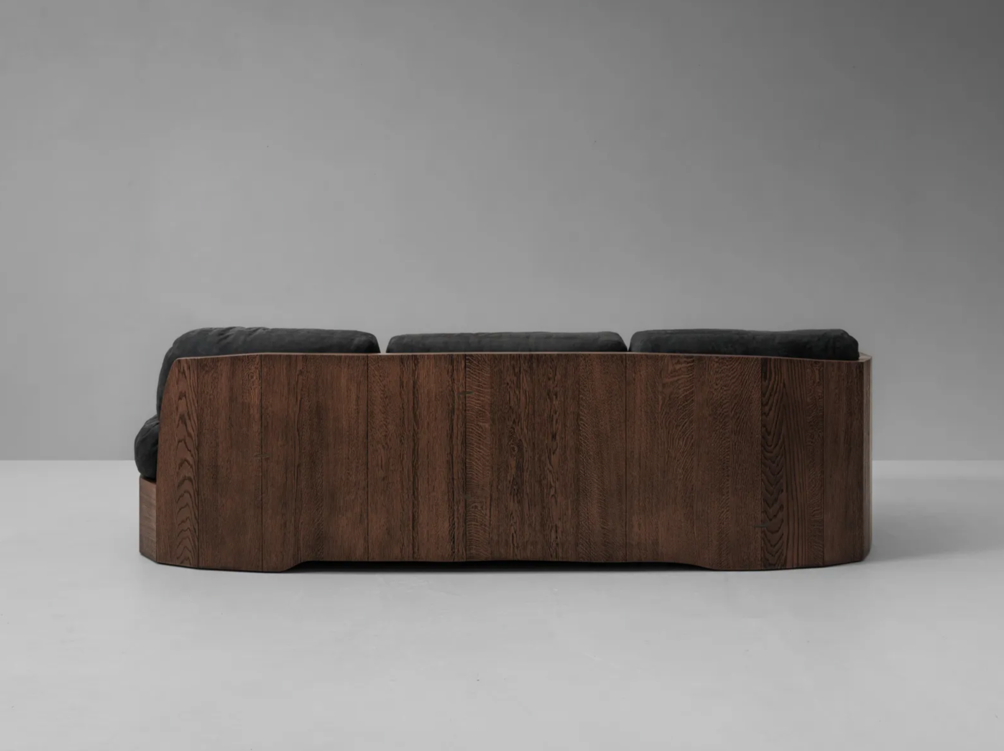 A spacious, asymmetrical sofa with a solid wood frame and plush upholstery, for relaxed and supportive seating. Available in brushed dark French oak, with patinated brass details and fabric or leather upholstery. Its organic, off-kilter form evokes the fluidity of nature, where the irregularity feels both effortless and deliberate.