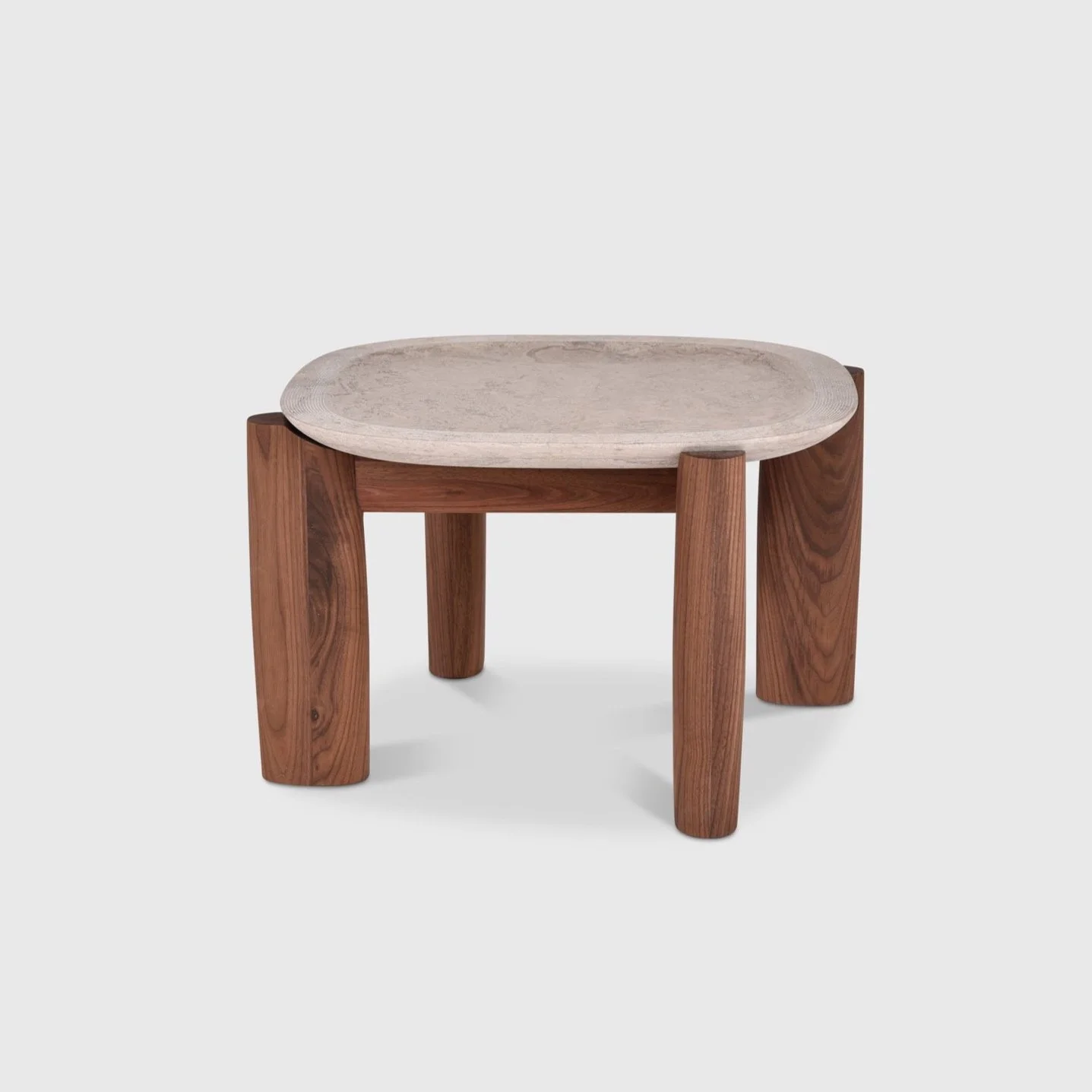 A mixed textured stone top with a solid walnut base