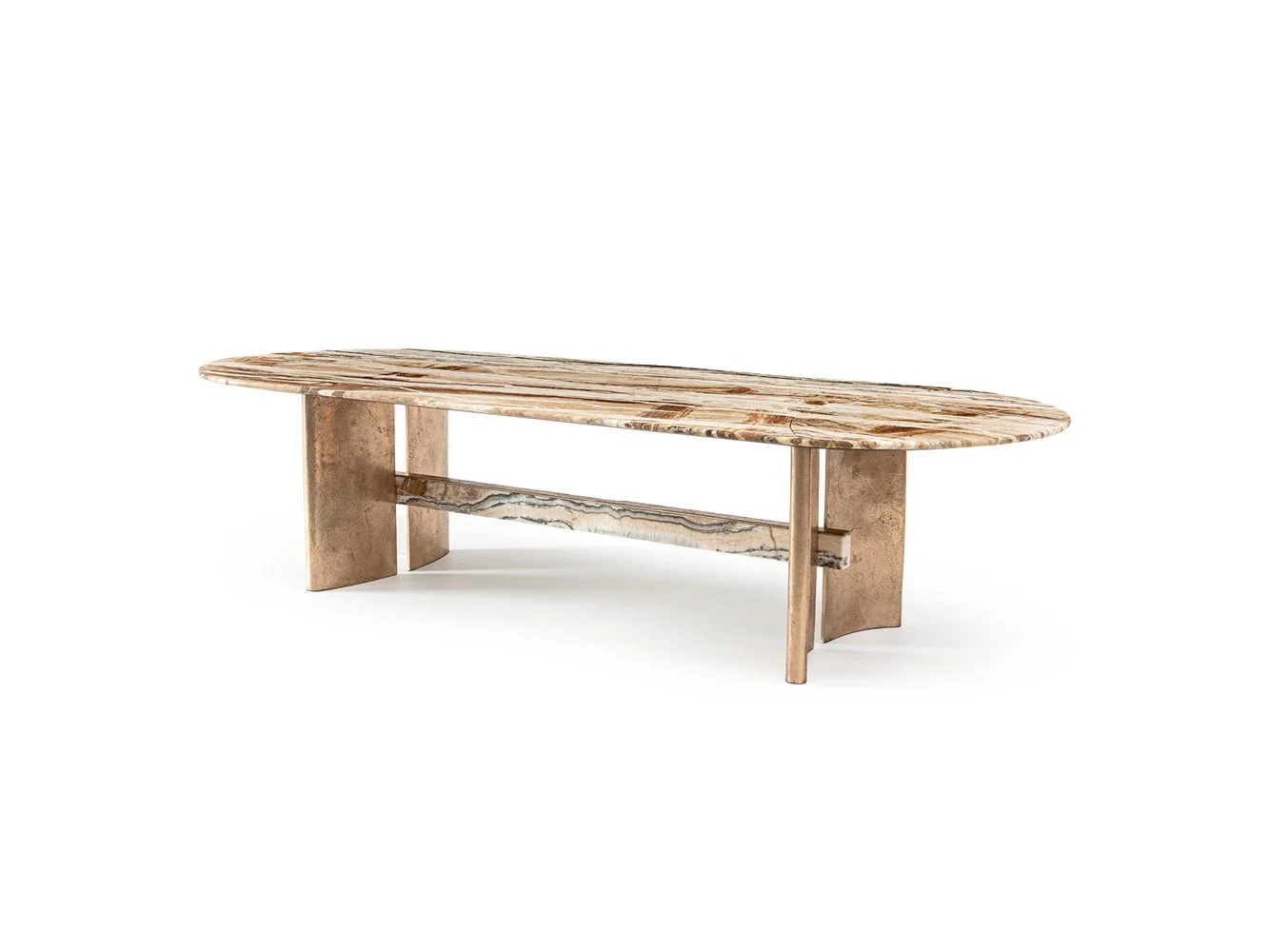 The shapes of dining table Spinnaker take inspiration from elegance and lightness of the sails of the boats that are unfurled to the wind during the sailing. The marble top is available in one unique piece, or it can be cut into three curved parts following the structural base with two arches that recall the typical geometry of architecture of the Thirties. The melted brass parts of the base are realized by casting liquid metal into a mould made of special sand.