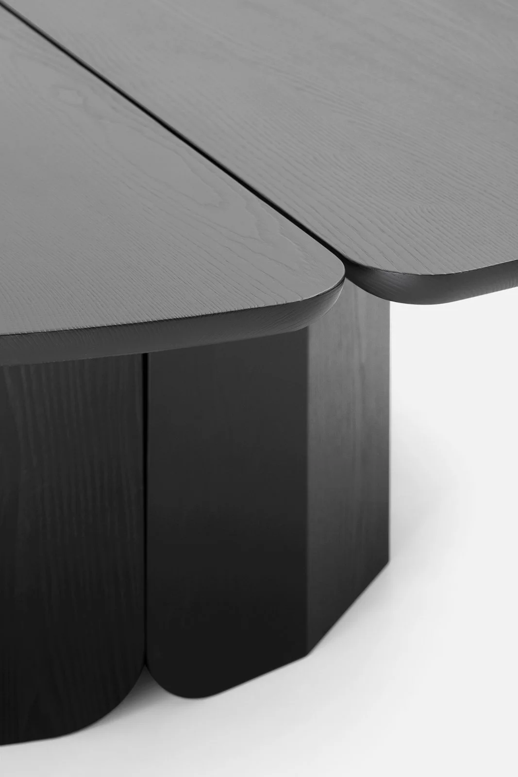 The table has a circular top in brushed ash stained black, available with a matte or glossy finish. It is composed of two semicircles that form a central slit: the edge is rounded and curves towards the center, highlighting the juxtaposition of these two parts. The leg is the result of craftsmanship that has evolved over time with the support of contemporary manufacturing technology. It is composed of solid wood planks that create facets and an opening along the curve. The parts are never joined, but always separated by a shadow line that allows a glimpse of the simple shapes that make up the final product. Also available in natural and walnut-stained ash.