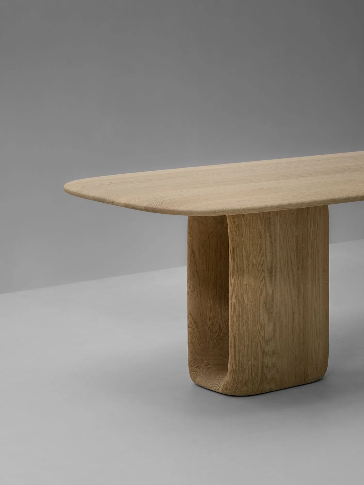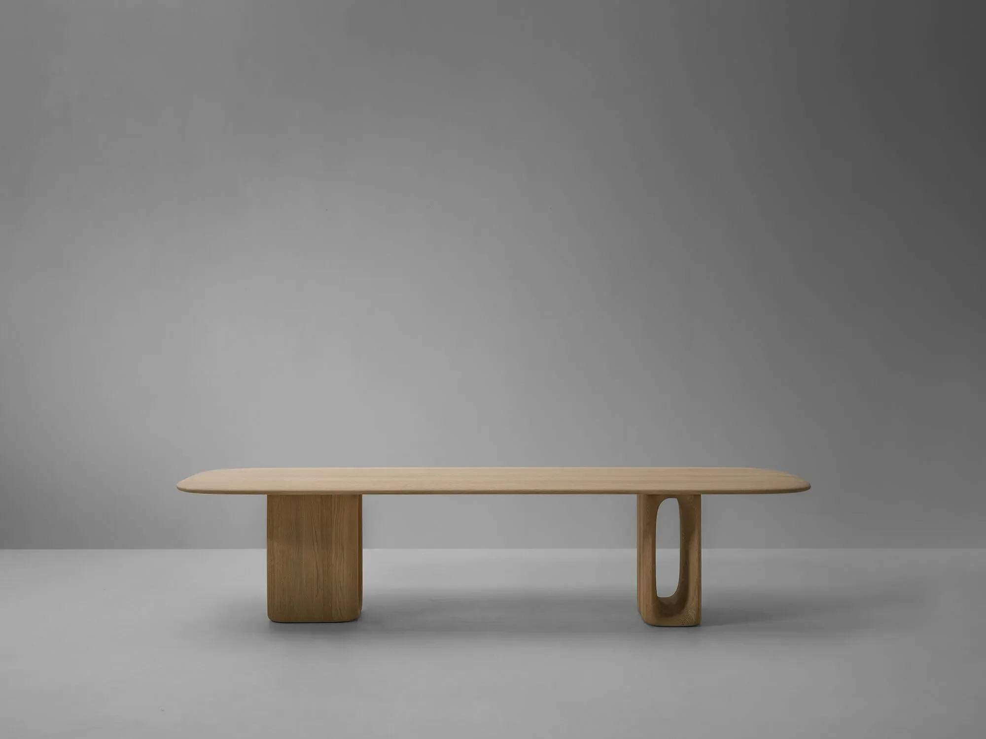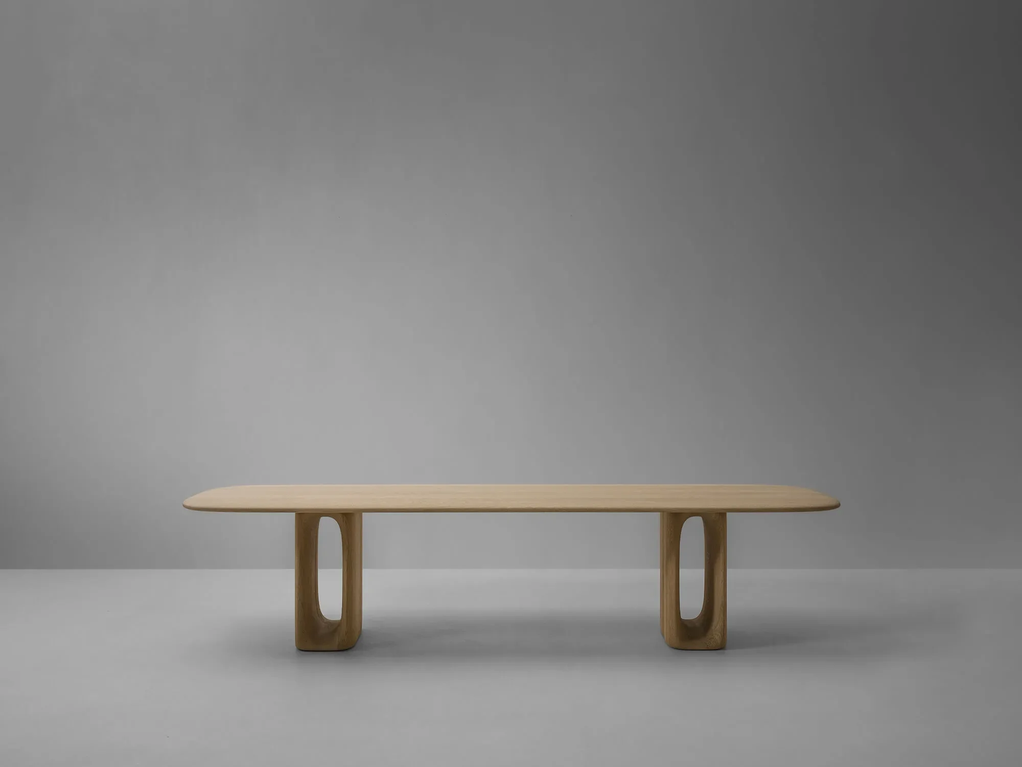 A rectangular dining table with rounded edges, where the top is cantilevered over two oblong legs with oval cutouts. The legs can be arranged in either a parallel or perpendicular formation, offering flexible placement options. Available in French oak. Evoking the grace of a design seemingly worn by the elements over decades, its organic shape and softly sloping edges create a smooth, delicate profile that exudes natural elegance.