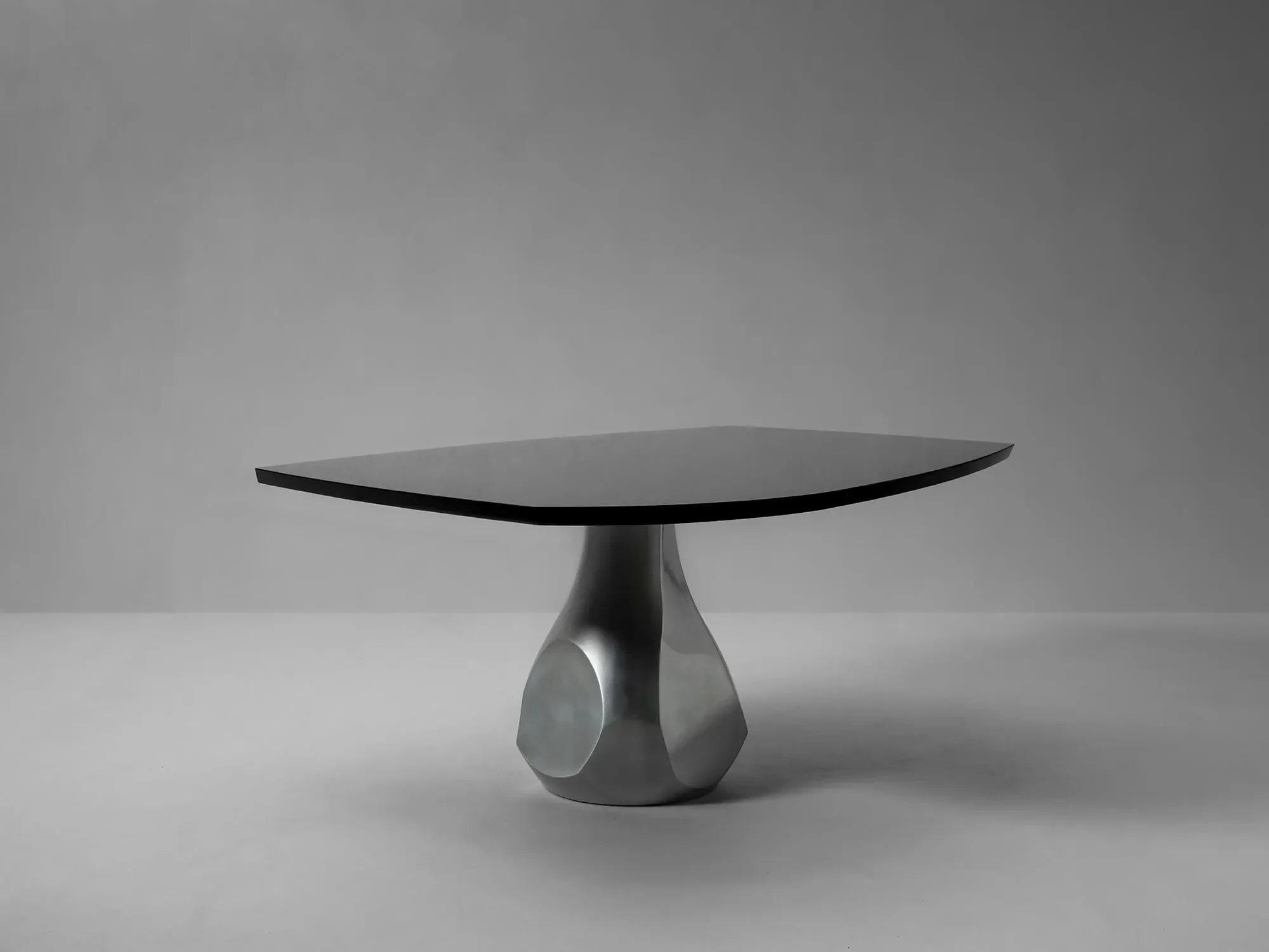 A compelling table featuring a slim, organically shaped top and a contrasting robust, asymmetrically contoured aluminium base. A more compact rendition of the iconic PUKALU table. Available in French oak, walnut or highgloss. Its sleek form and sturdy aluminium base crafta moment of shared experience steeped in tactile delight.