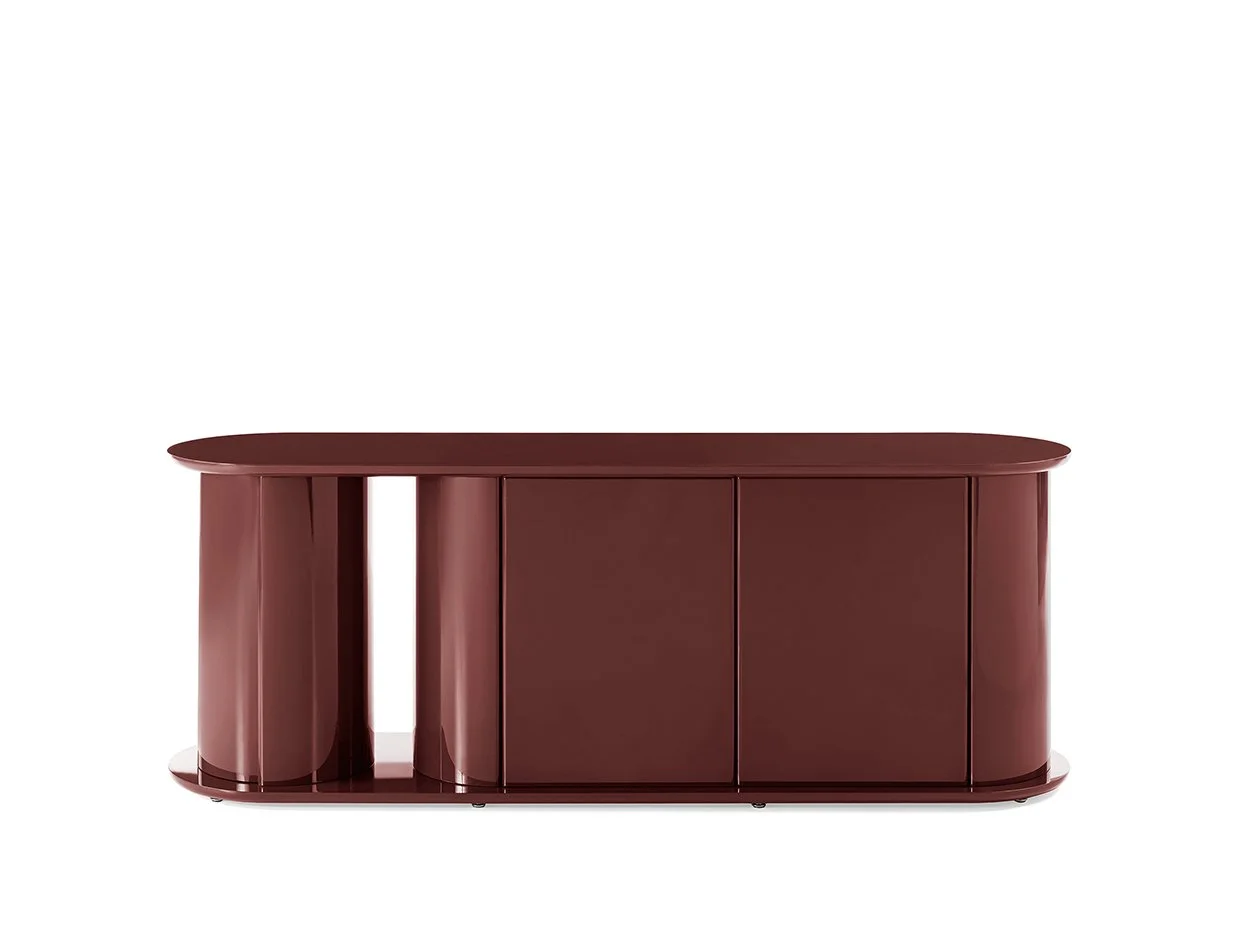 Sideboard with structure, shelves and half-cylinder in glossy or opaque lacquered wood. Half-cylinder with front or rear opening. Available version with rotating cylinders, in pre-established positions, which allows the closing of the compartments. Satin brass details.