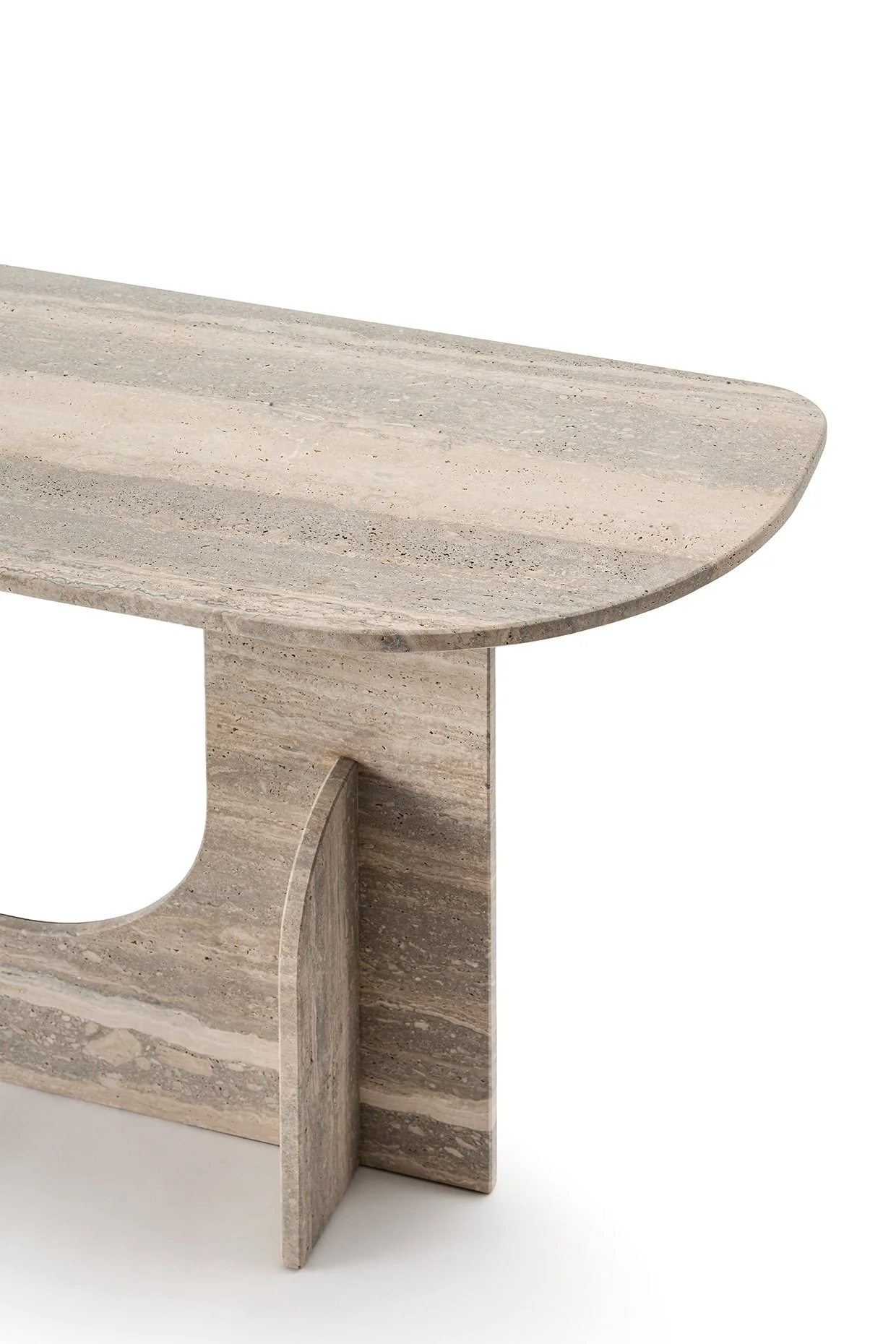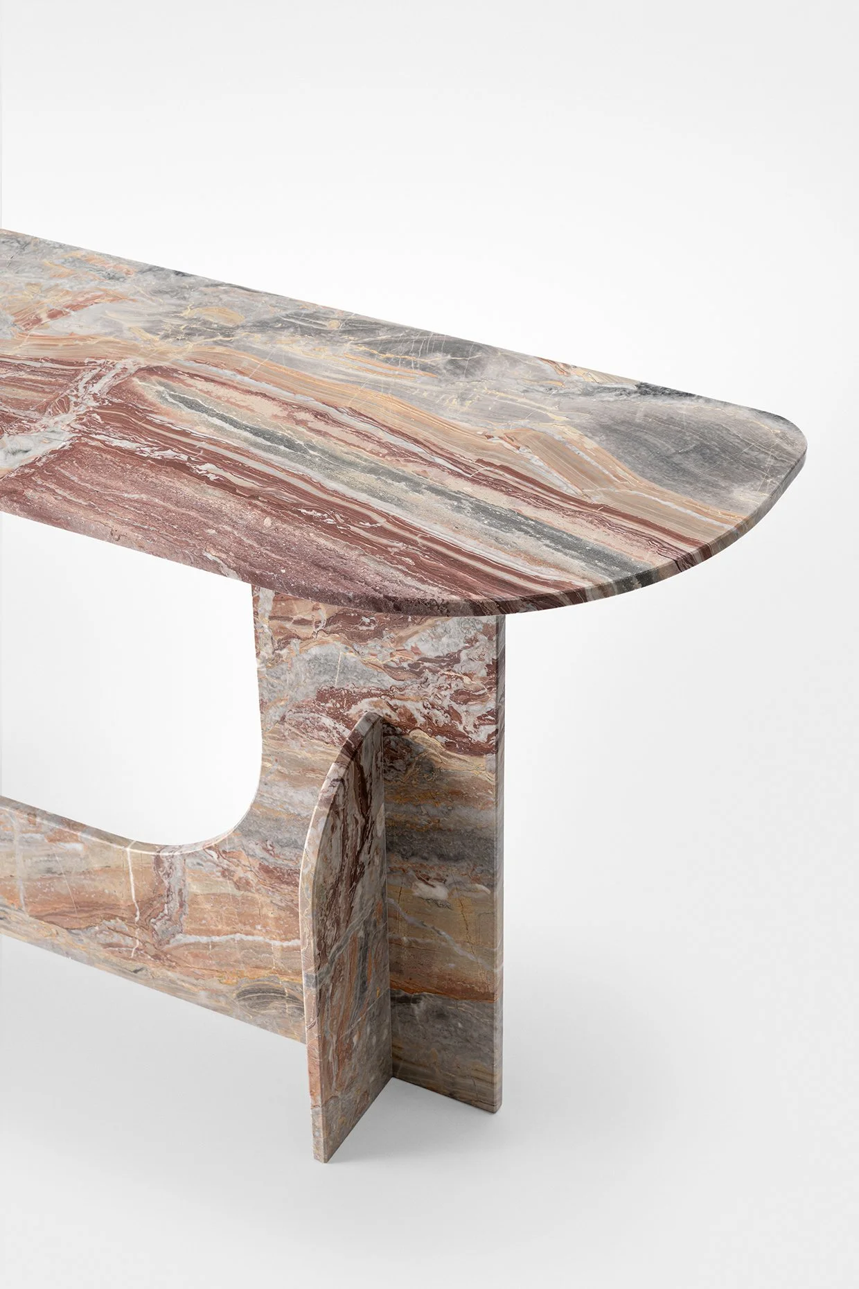 Console in stone with "Fango" lacquered metal parts. Wall positioning recommended.