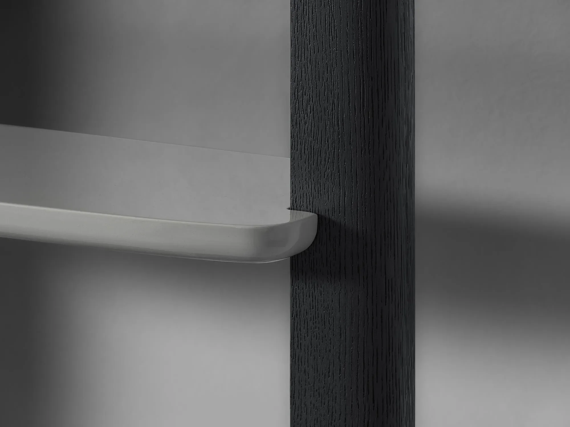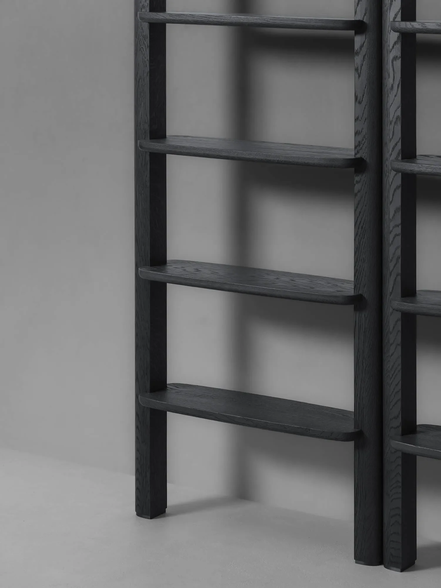 A modular, free-standing bibliothèque, crafted in solid wood with an integrated shelving system that incorporates subtle steel or brass details. It can be attached to a wall, floor or ceiling through fixing points. The beams are available in French oak and the shelves in French oak, an ultra-matte finish or a high-gloss finish. Drawing on the architectural essence of steps, it casts an aura of sophistication and gravity, offering not just a functional piece but also a statement of timeless design that elevates any space.