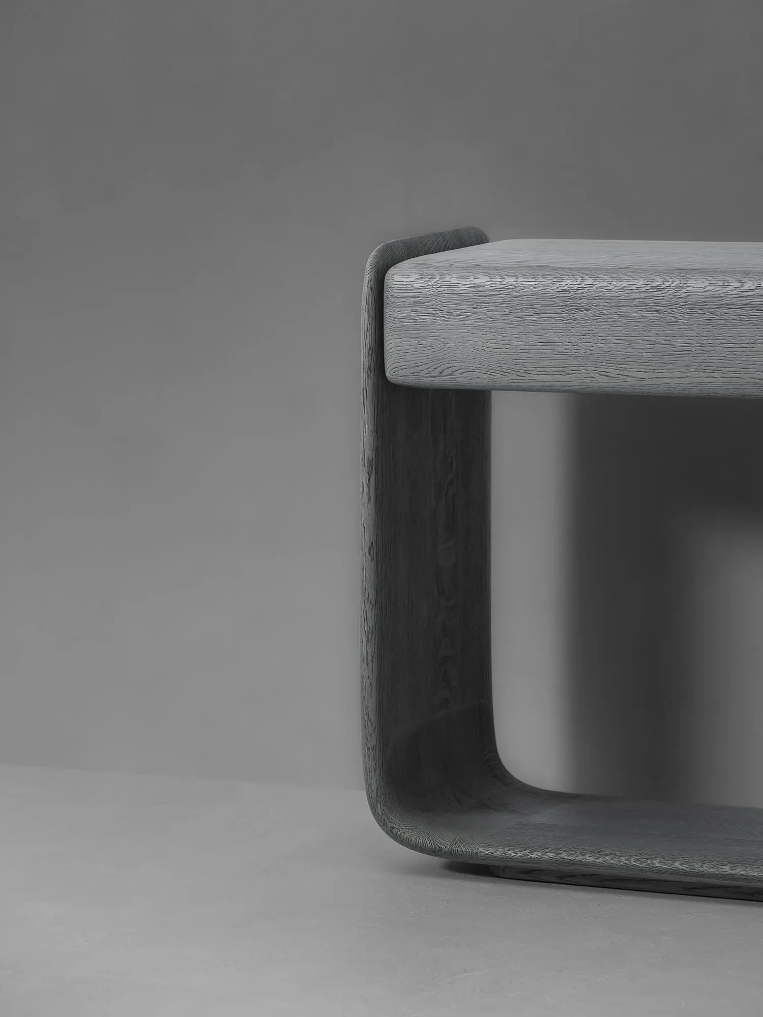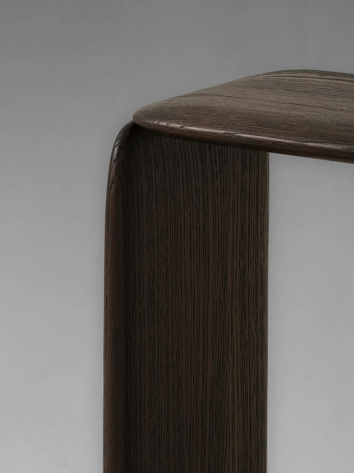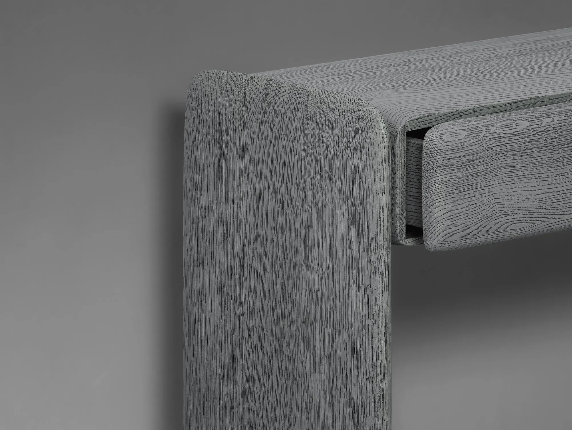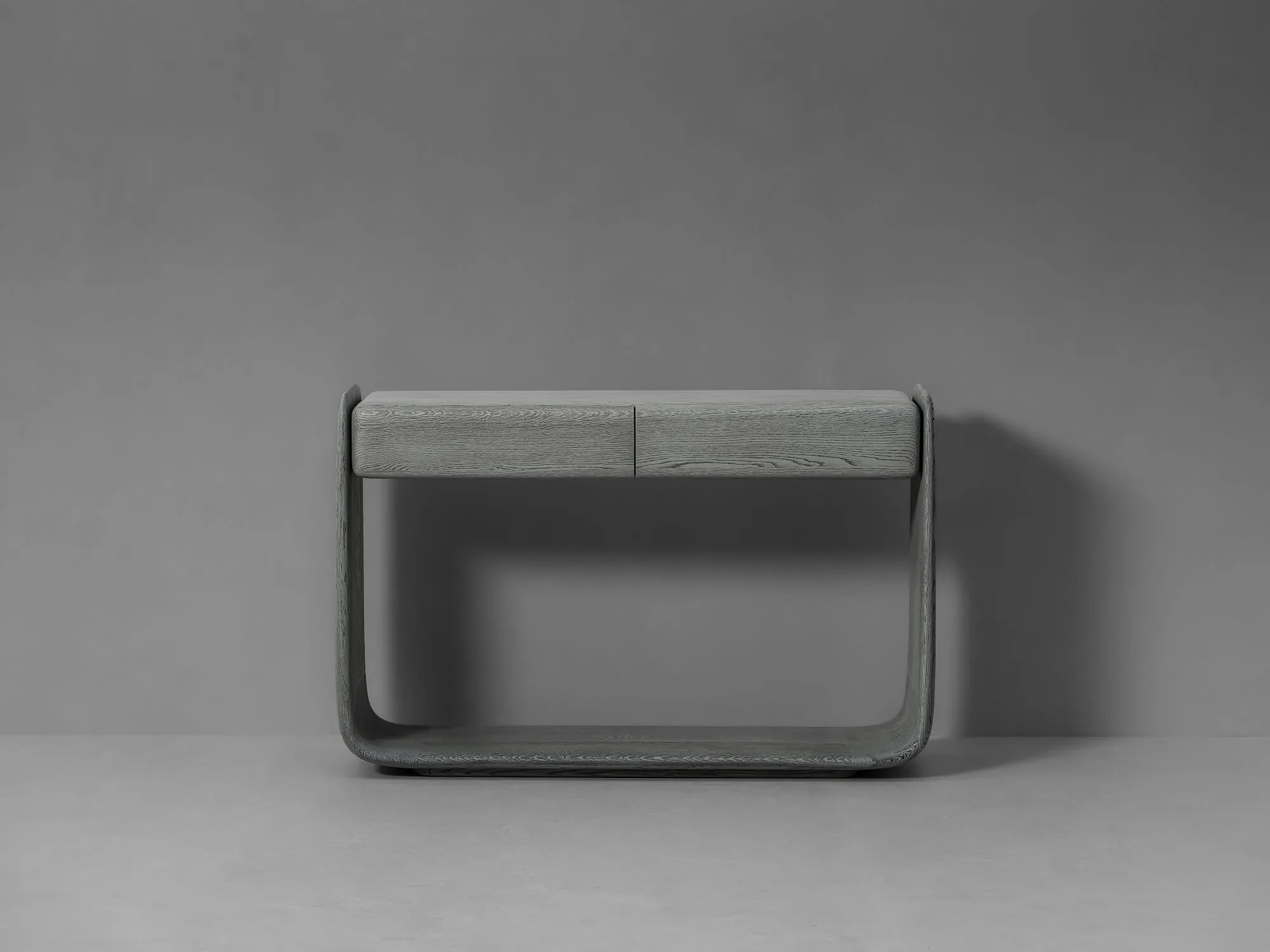 A slender console table with a base that sweeps upward at either end to form legs that seamlessly support its top. Available in French oak. Impeccably sculpted, the shape embodies a fluid blend of solidity and grace, with its floating silhouette echoing the serene expanse of the desert after which it is named. Option with 2 drawers.